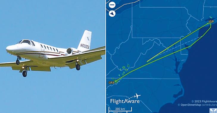 左图为涉事的同款小型飞机。根据航班追踪网站FlightAware,涉事飞机在抵达纽约上空后,做出近180度转弯,回头往西南飞过华盛顿上空并进入弗吉尼亚州。(图源:FlightAware网站)