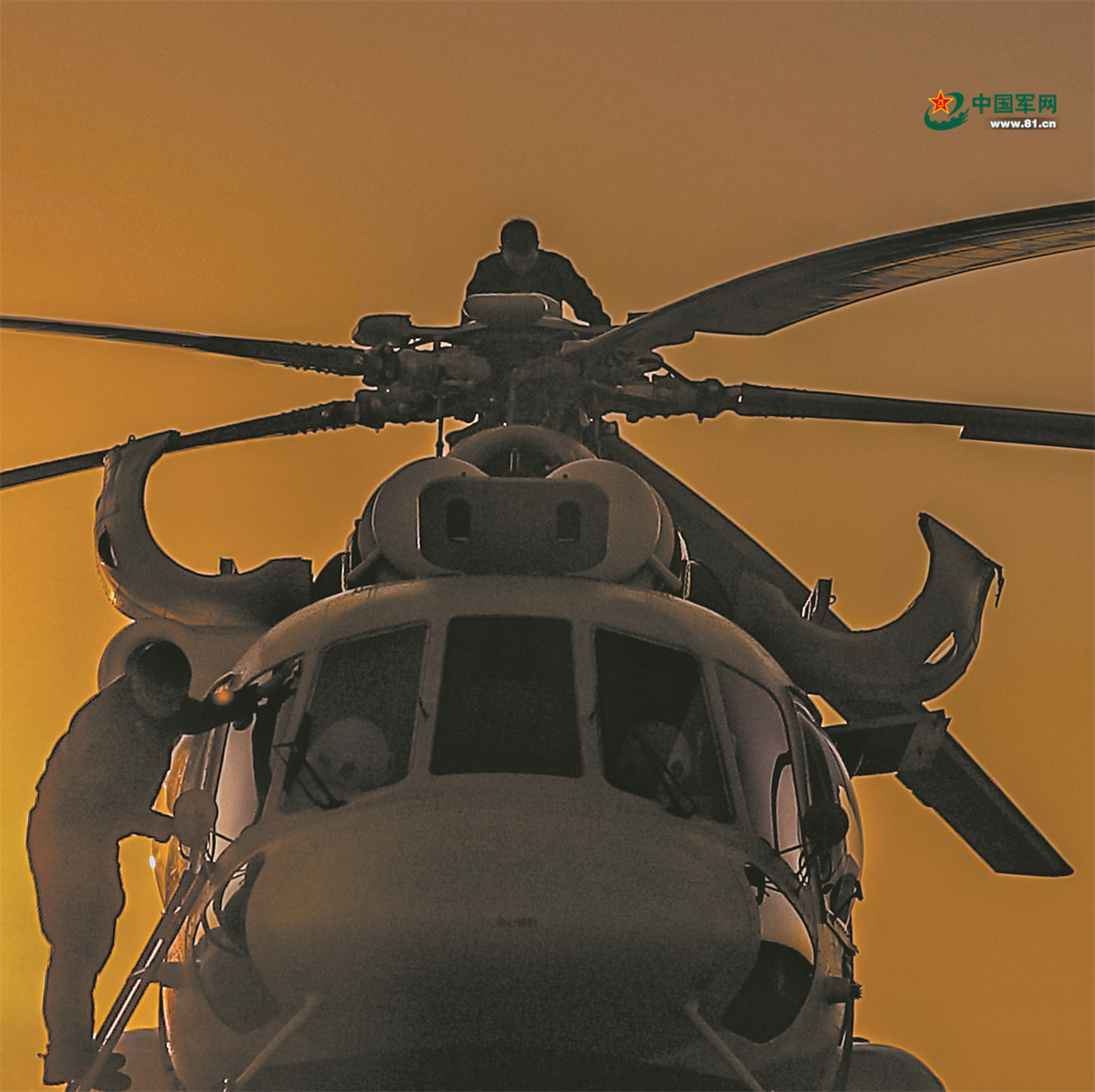 晚霞映照下,机务人员检查维护战机。