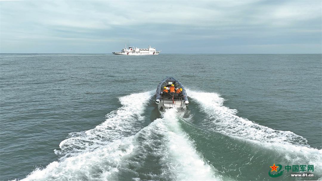 “有‘伤员’急需转运救治。”医疗艇随即投入转运任务,快速驶向“和平方舟”。海浪翻滚,给转运带来一定困难。官兵把握波浪起伏规律,快速完成“伤员”转运……
