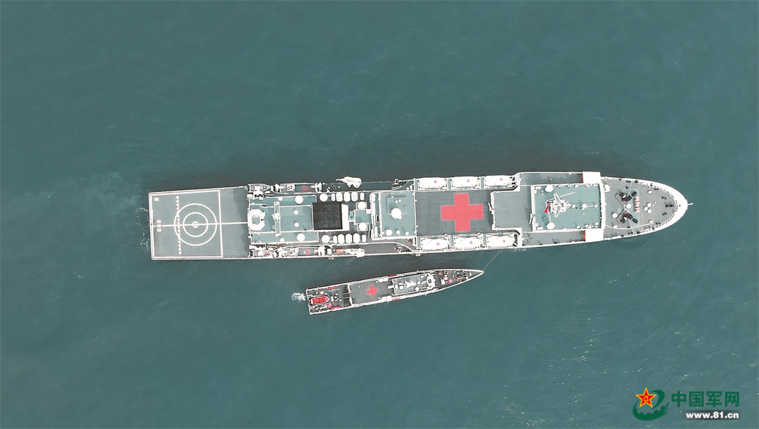 医疗艇靠近“和平方舟”,准备转运“伤员”。