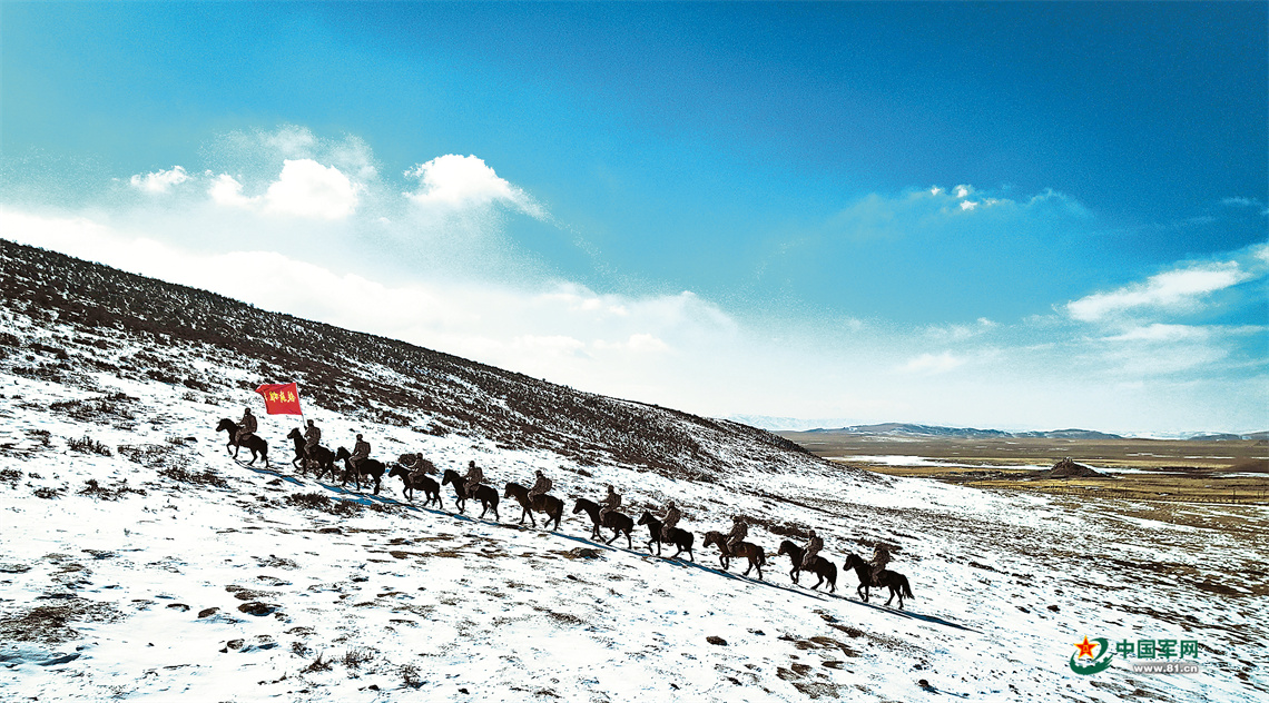 哨所官兵骑马踏雪巡逻。