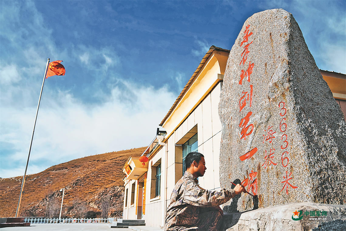 哨所战士为石刻描红。
