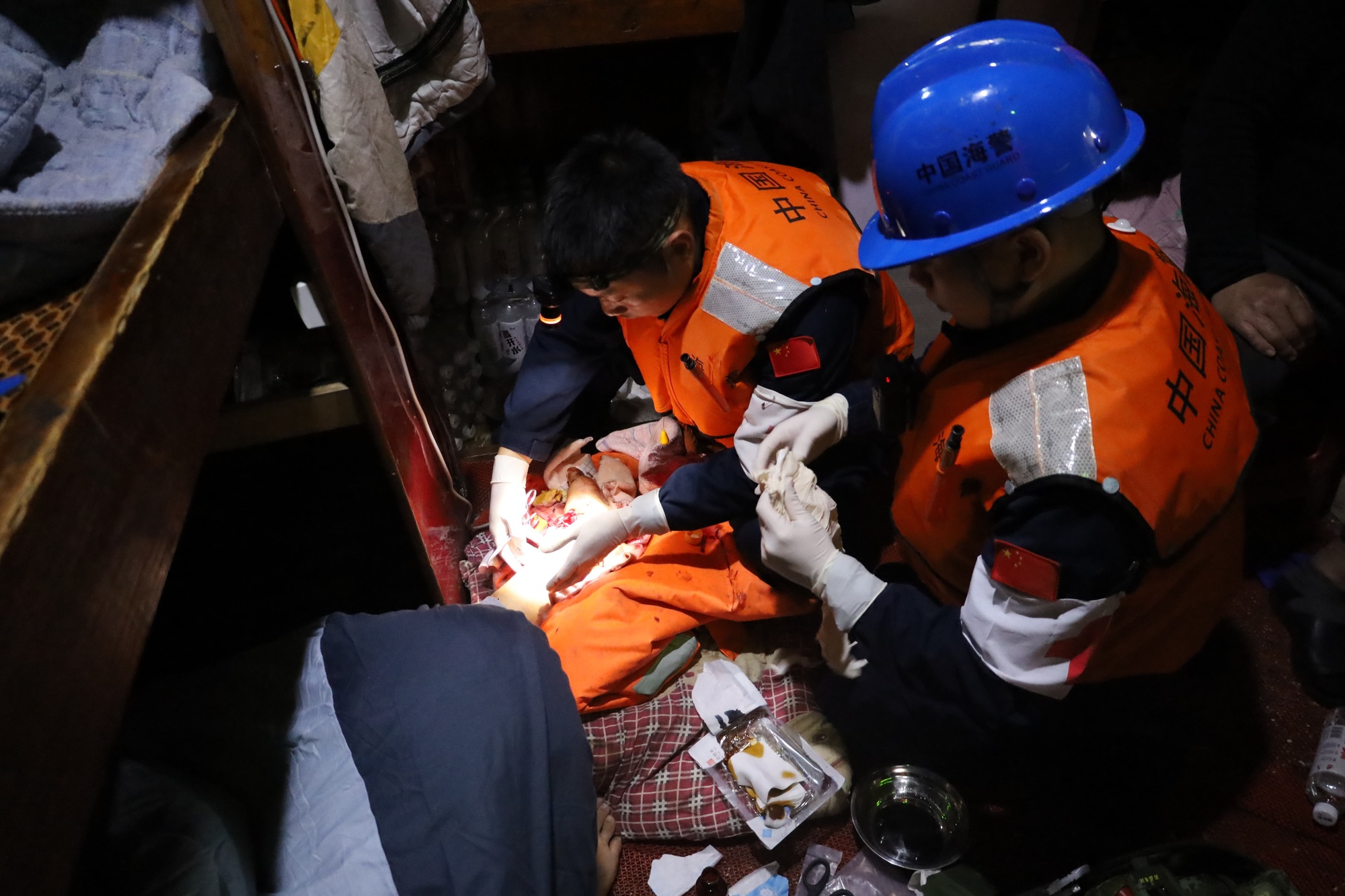 2月4日8时45分,中国海警局直属二局台州舰接到紧急报警称:在东海某海域,一名渔民在海上作业时不慎被锚链保险缆击中脚踝,导致左脚踝骨折、血流不止,情况十分危急。