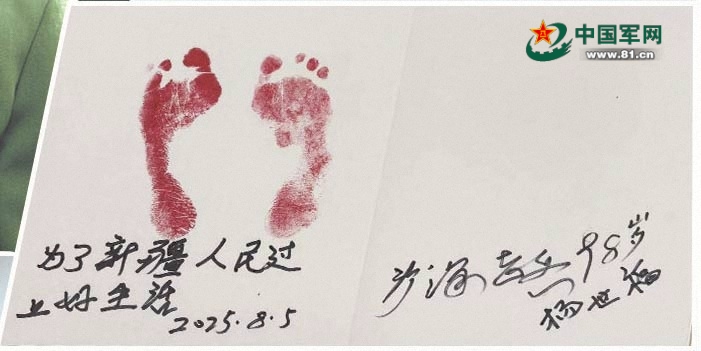 我曾在原沈阳军区《前进报》社工作多年,退休后笔耕不辍,不时到各地采风,采写一些稿件。2025年8月,我与长期致力于关爱老兵、记录老兵故事的辽宁鞍山拥军志愿者葛继红一行人,到新疆拜访杨世福老人,并为他拓下两枚红脚印,用以开展“英雄足迹”主题展览活动。当时,我们还和杨老约定,今年再去新疆看望他。