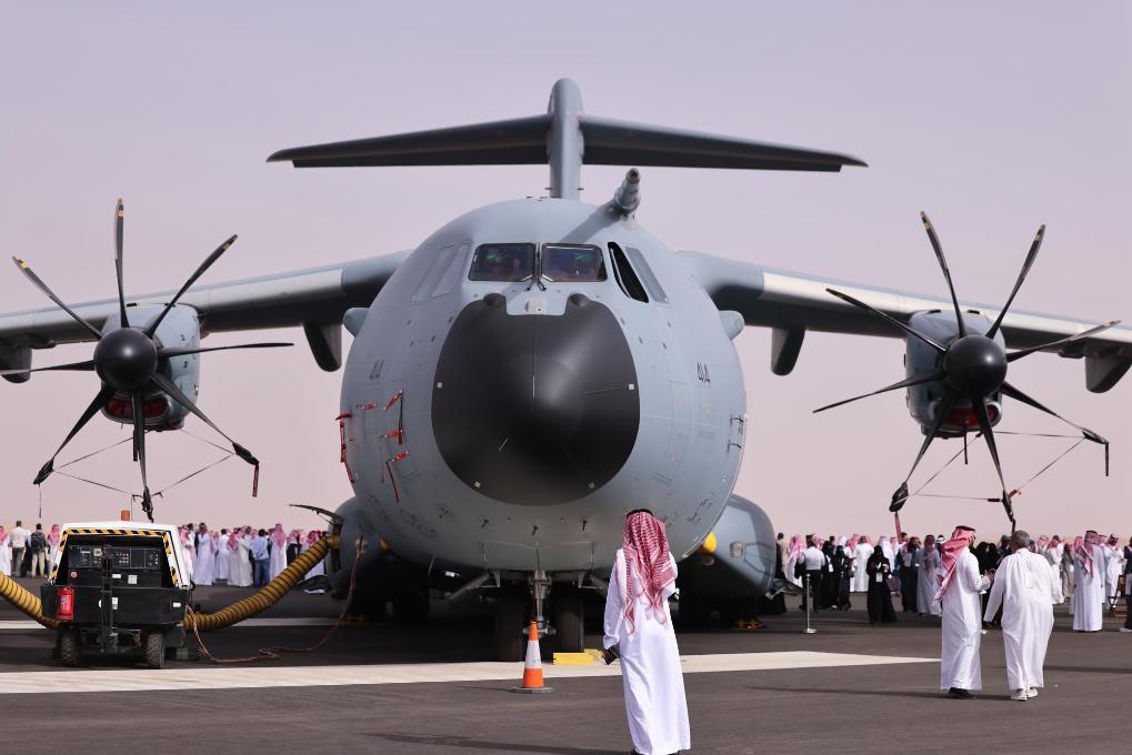 2月11日,在沙特阿拉伯利雅得举行的第三届沙特世界防务展上,观众在户外展区参观各类飞机。新华社记者王海洲摄