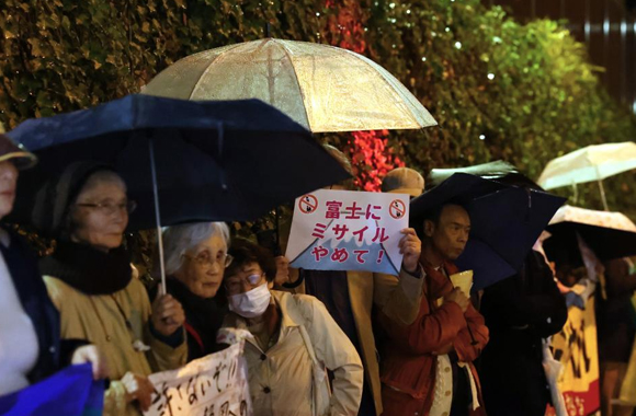 在东京的日本防卫省门前,大量抗议者冒雨高喊“必须停止部署远程导弹!”“给民众一个合理解释!”“反对进行战争准备!”等口号。